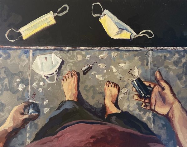 This piece was made during the beginning of the Covid-19 outbreak when all businesses were shut down and people were in isolation. I had to leave everything behind in San Francisco and return to Miami without any art supplies. I needed to paint and I only had a really old bottle of black and red acrylic. So I chopped up some chalk until it became powder and mixed it into toothpaste to create yellow paint. This piece is made of toothpaste, chalk, acrylics and black pen.