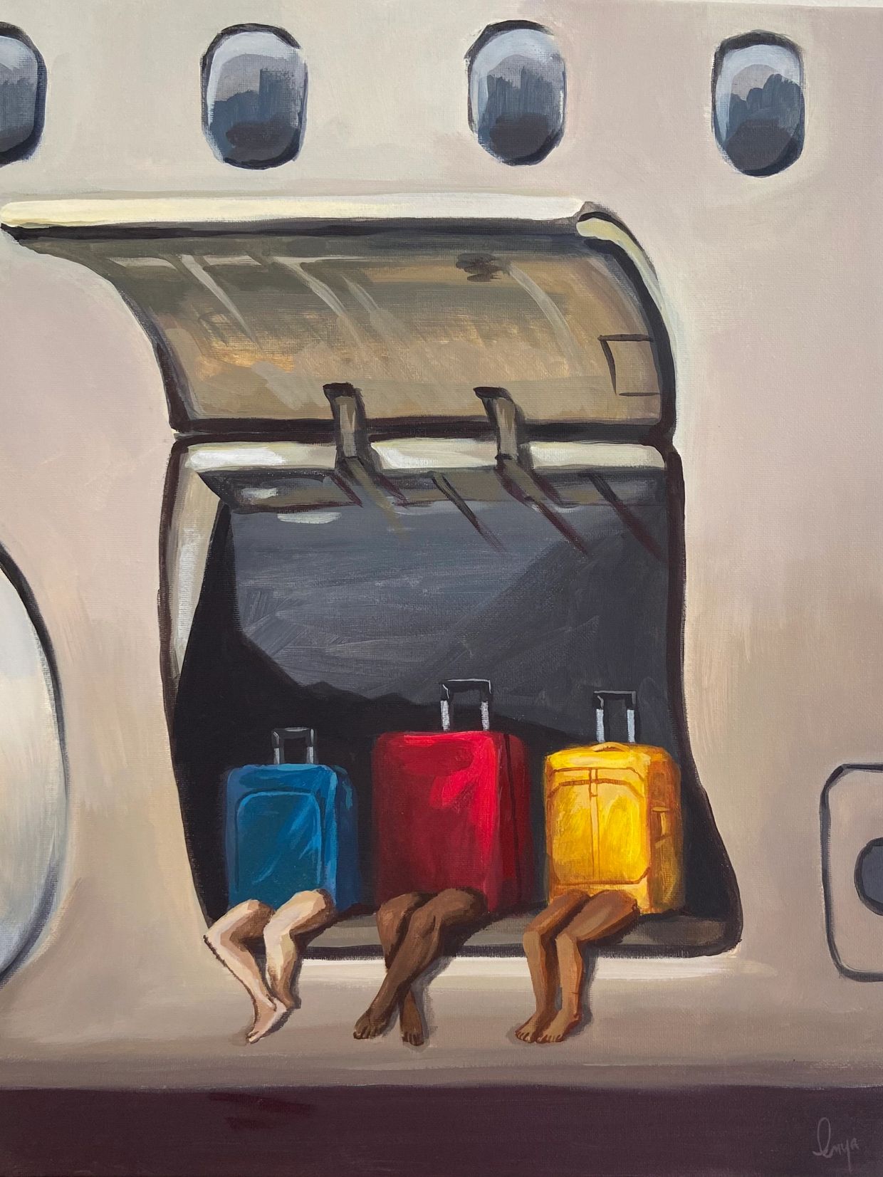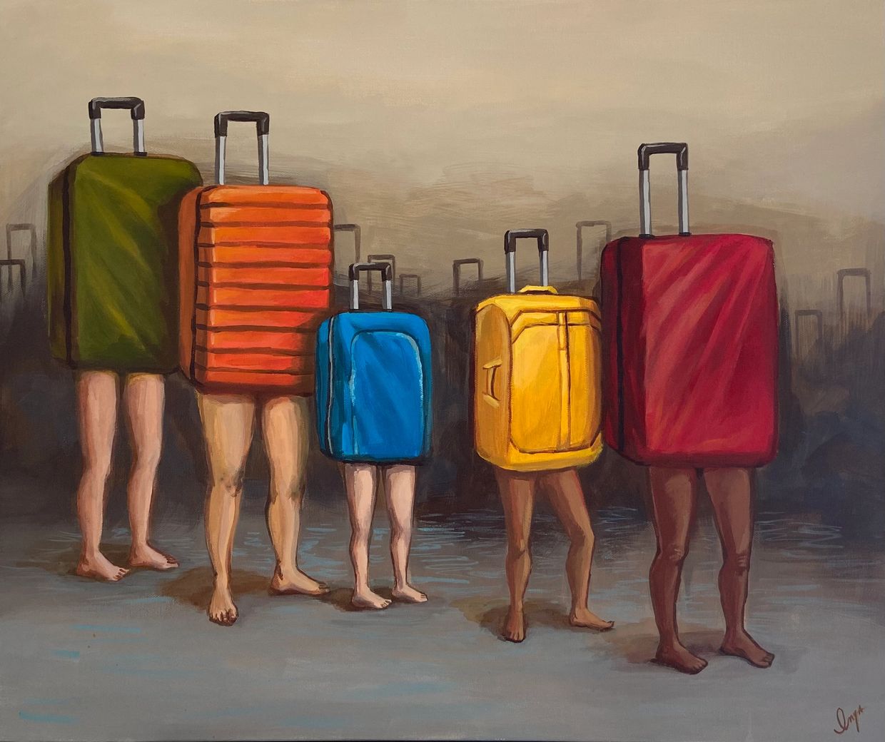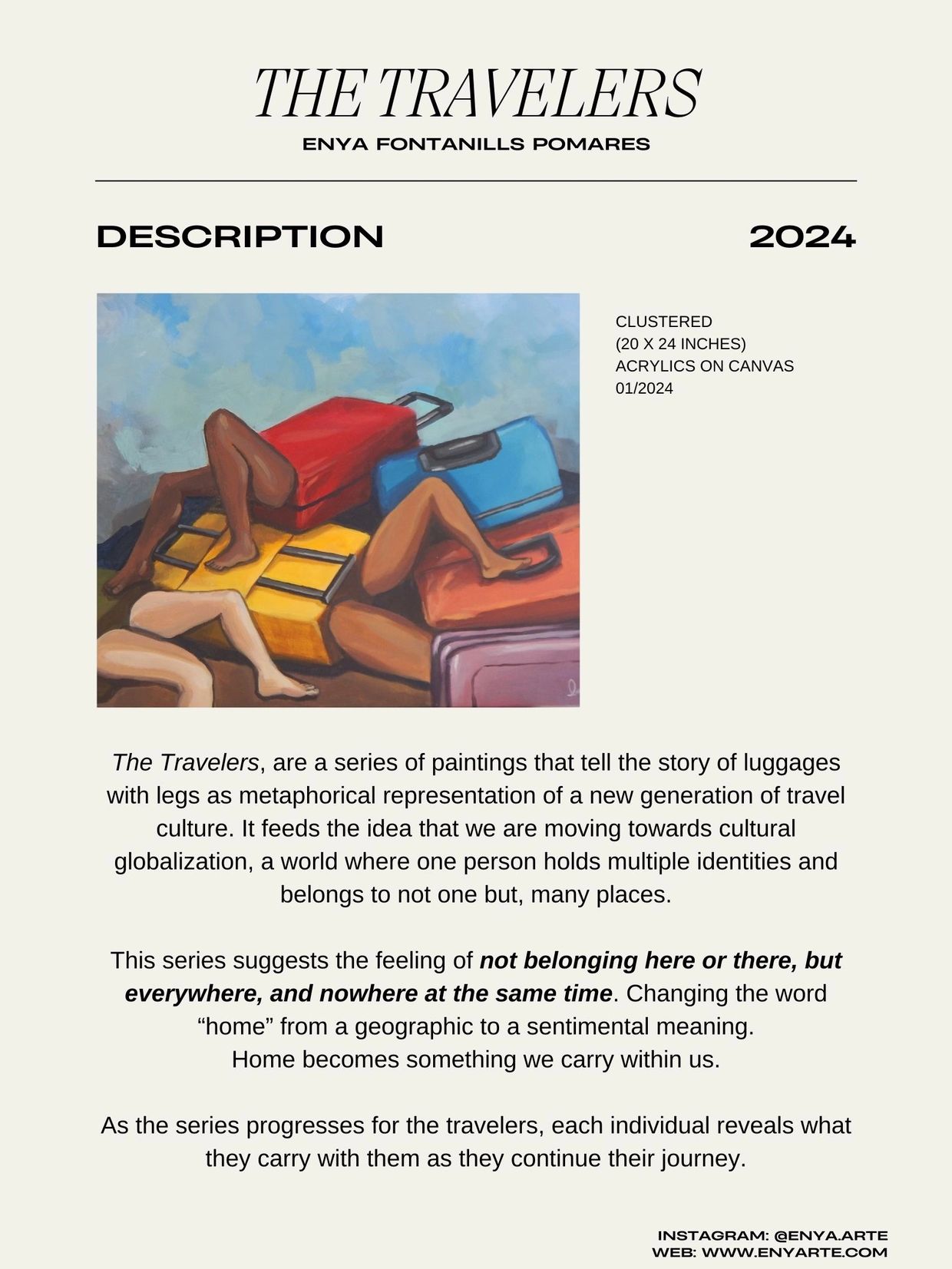 Los Viajeros , son una serie de pinturas que cuentan la historia de maletas con piernas como representación metafórica de una nueva generación de cultura viajera. Alimenta la idea de que nos dirigimos hacia una globalización cultural, un mundo en el que una persona tiene múltiples identidades y pertenece no a uno, sino a muchos lugares. Esta serie sugiere la sensación de no pertenecer aquí ni allá, sino a todas partes, y a ninguna al mismo tiempo . Cambiando por completo la palabra "hogar" dé un significado geográfico a un significado sentimental. El hogar se convierte en algo que llevamos dentro de nosotros. A medida que avanza la serie de los viajeros, cada individuo revela lo que lleva consigo mientras continúan sus viajes.