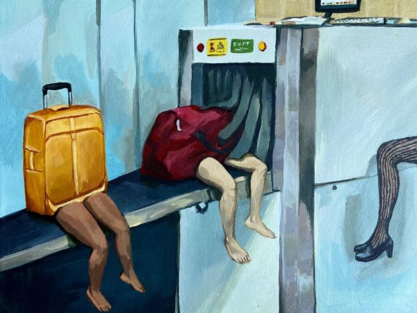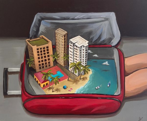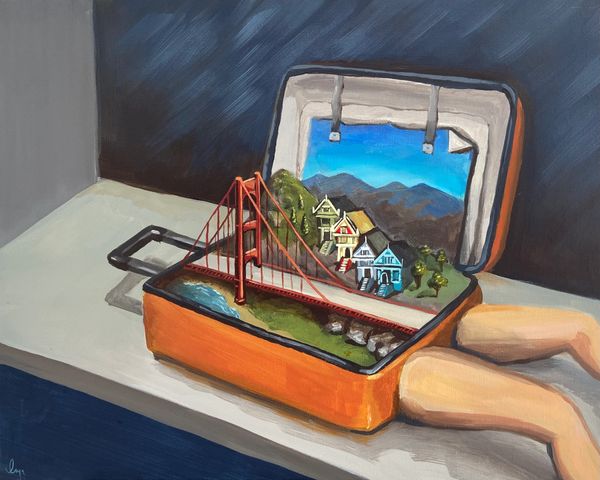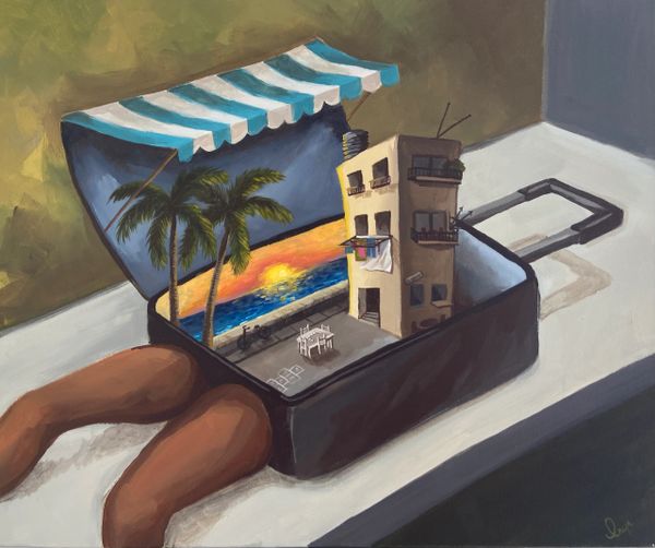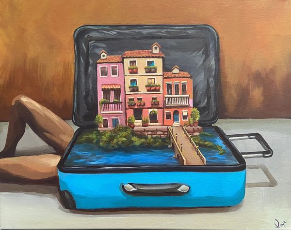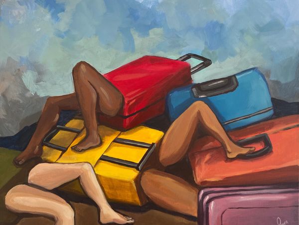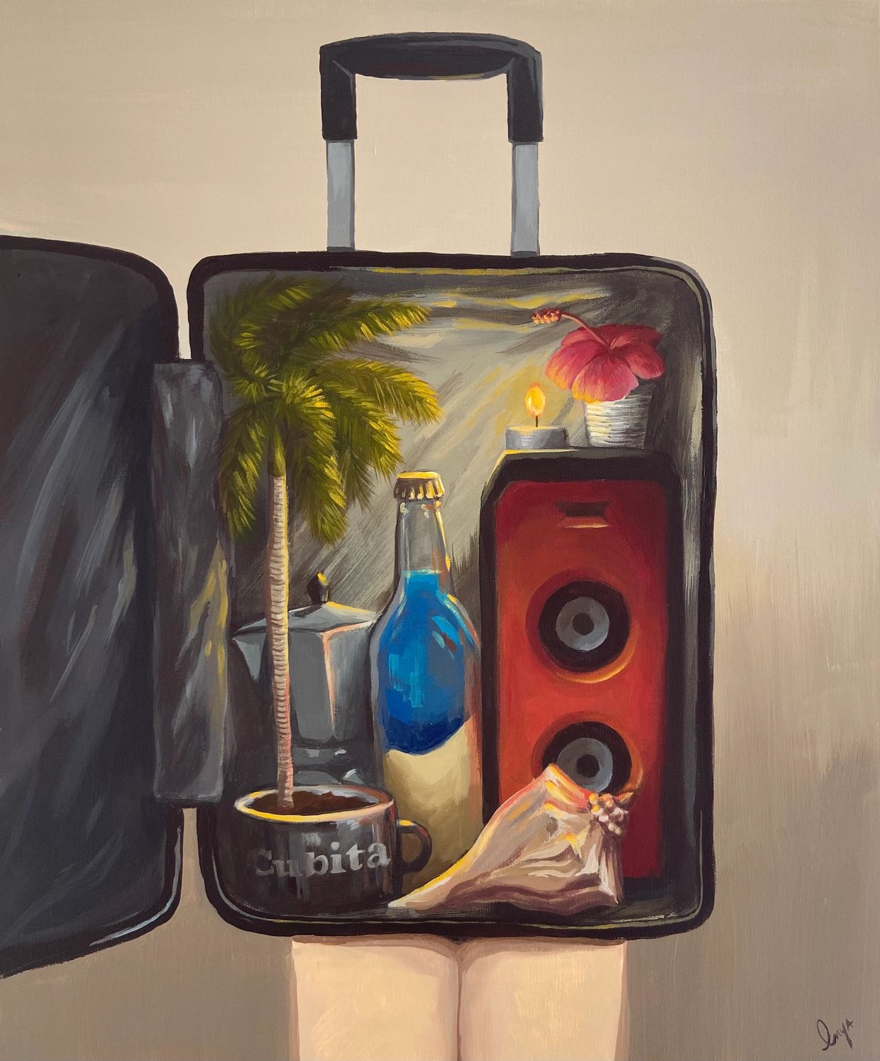 Los Viajeros , son una serie de pinturas que cuentan la historia de maletas con piernas como representación metafórica de una nueva generación de cultura viajera. Alimenta la idea de que nos dirigimos hacia una globalización cultural, un mundo en el que una persona tiene múltiples identidades y pertenece no a uno, sino a muchos lugares. Esta serie sugiere la sensación de no pertenecer aquí ni allá, sino a todas partes, y a ninguna al mismo tiempo . Cambiando por completo la palabra "hogar" dé un significado geográfico a un significado sentimental. El hogar se convierte en algo que llevamos dentro de nosotros. A medida que avanza la serie de los viajeros, cada individuo revela lo que lleva consigo mientras continúan sus viajes.